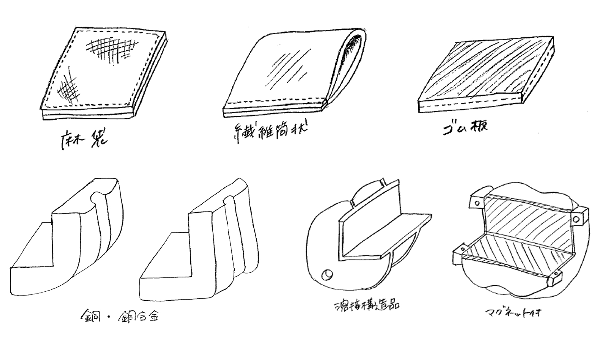 麻袋、繊維筒状、ゴム板のような簡単なものから