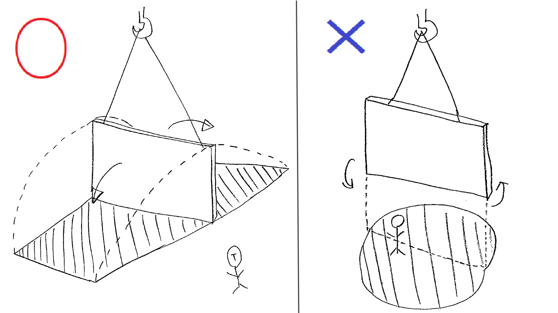 吊っている荷自体の真下だけではなく、その荷が回転あるいは転倒する範囲のことだよ!