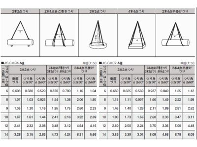 ワイヤロープ安全荷重表は、「吊り点数」と「吊り角度」だけで