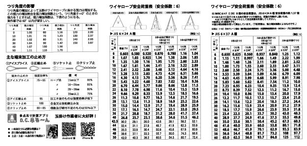 安全荷重表以外にも、ワイヤロープを使用する際の注意点が記載されてて便利だよ。