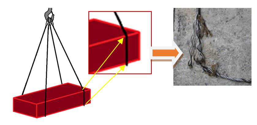 ワイヤロープを尖った角に当てると、折り曲げられた部分の強度が低下してしまうんだ。